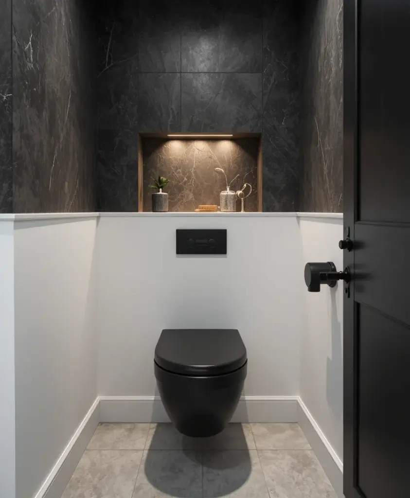 A soft two-tone wall behind a compact toilet adds subtle contrast while keeping the space calm. The darker lower section grounds the design, while the lighter upper portion keeps the room open. This approach visually organizes the wall without adding clutter. It works especially well in modern small bathrooms.