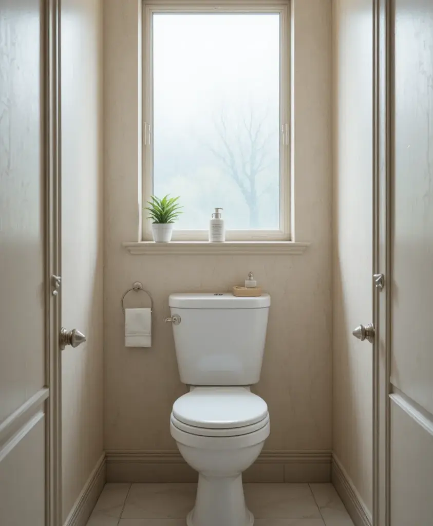 Placing a compact toilet beneath a window maximizes vertical space. Natural light brightens the area and reduces the need for bulky lighting fixtures. Keep window trim minimal and colors soft. This layout works well in narrow bathrooms.
