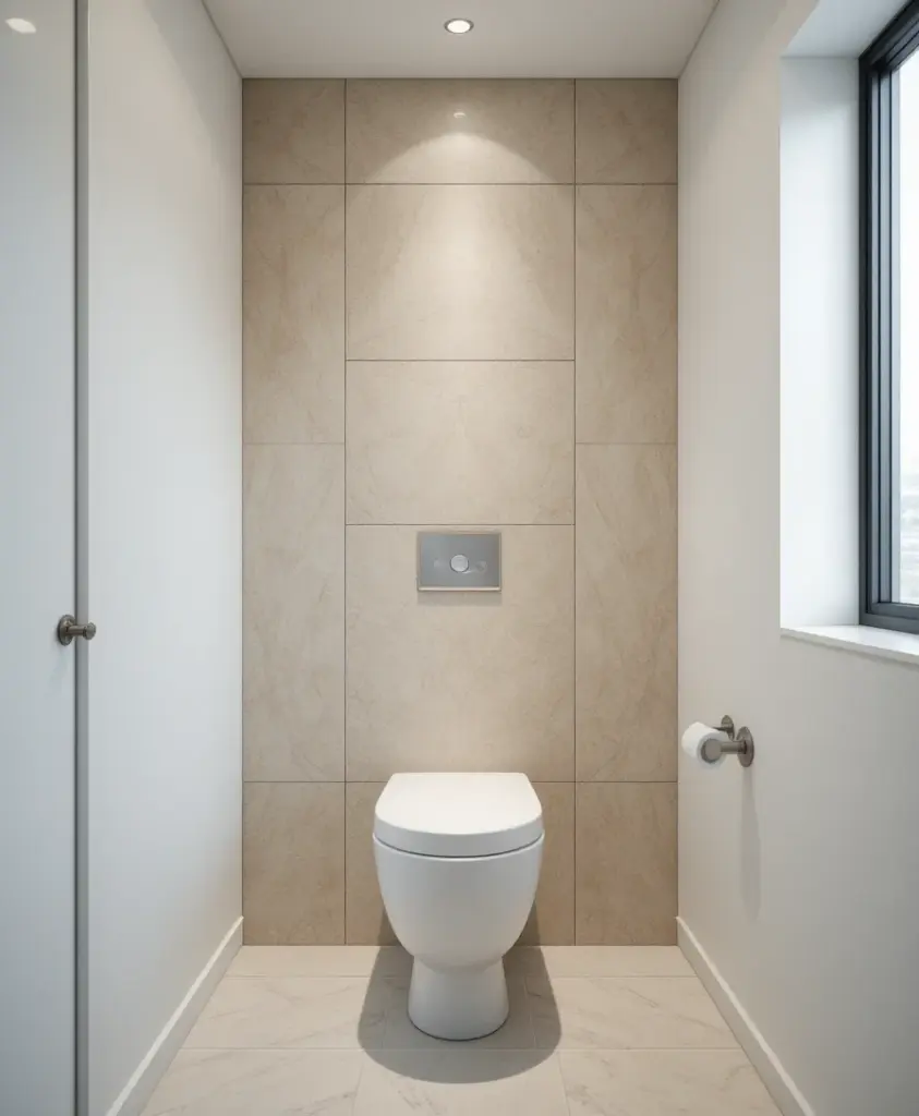 A minimalist tile panel behind a small toilet provides a clean focal point. Using large-format tiles reduces grout lines and keeps the space visually calm. Neutral tones maintain brightness. This design fits contemporary interiors.