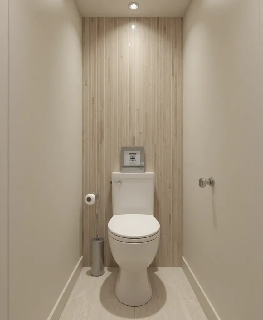 Light vertical paneling behind an ultra-compact toilet enhances height and adds subtle texture. Soft neutral tones keep the space airy. Minimal accessories prevent visual clutter. This design suits narrow bathrooms.
