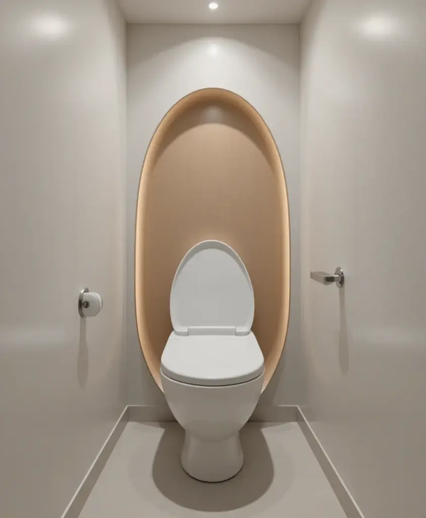 A softly rounded back wall accent behind a small toilet introduces gentle curves into the space. This architectural detail softens sharp corners and adds visual interest. Light neutral tones maintain brightness. The result feels calm and modern.